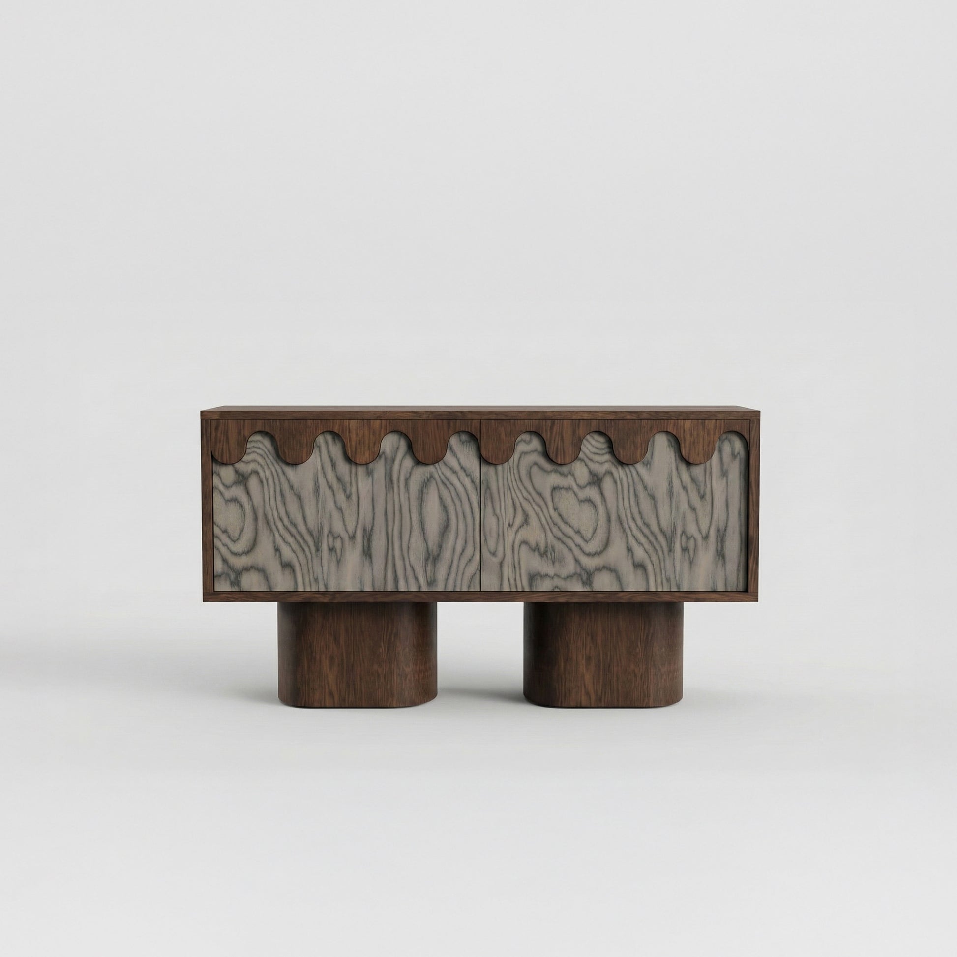 Komoda je vyrobena z masivní dřevěné konstrukce, opatřené kvalitní přírodní dýhou, která zvýrazňuje krásu kresby dřeva. Kontrast mezi tmavším korpusem a světlejšími dvířky vytváří nadčasový vzhled, zatímco masivní válcové nohy dodávají nábytku architektonickou stabilitu.