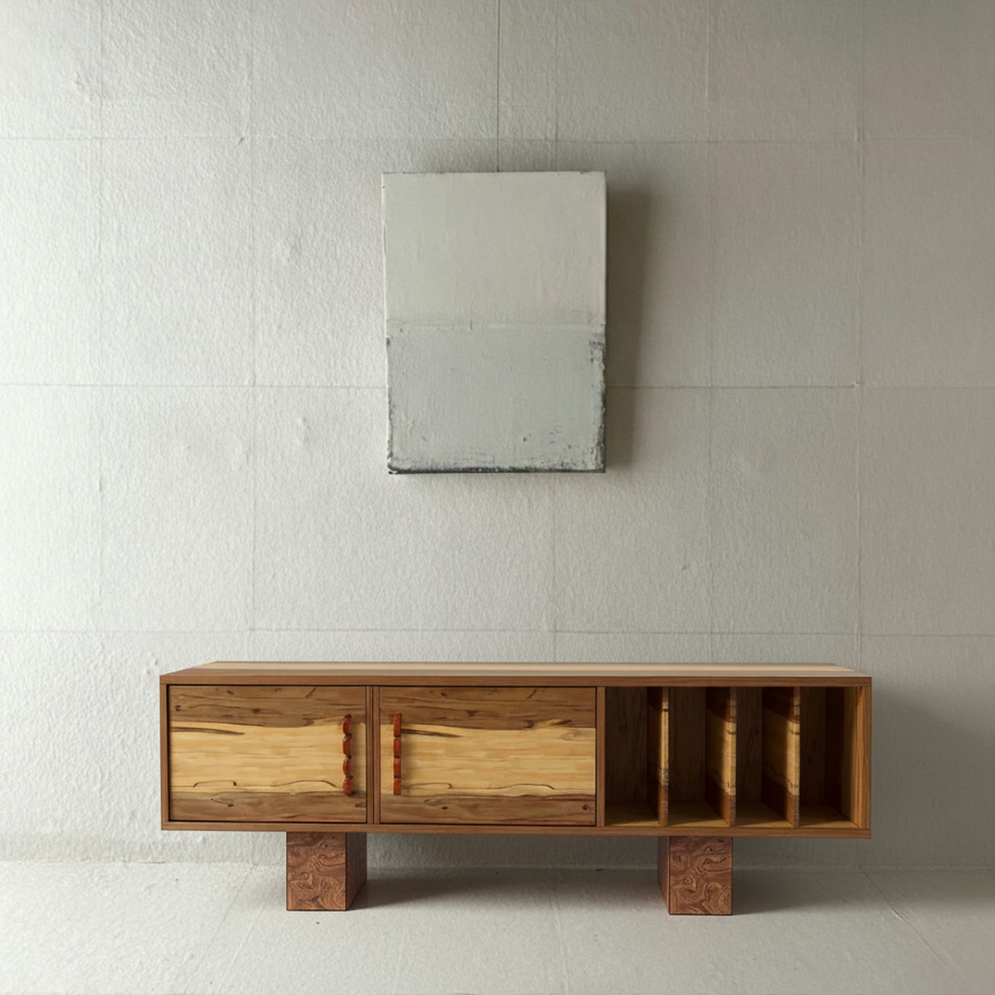 Otevřené vertikální přihrádky jsou ideální na gramofonové desky, knihy či dekorace, zatímco uzavřená skříňka umožňuje ukládat vše, co má zůstat skryto. Masivní nohy ve tvaru bloků dávají komodě stabilitu a osobitý charakter – přináší do prostoru řád, teplo a řemeslnou autentičnost.
