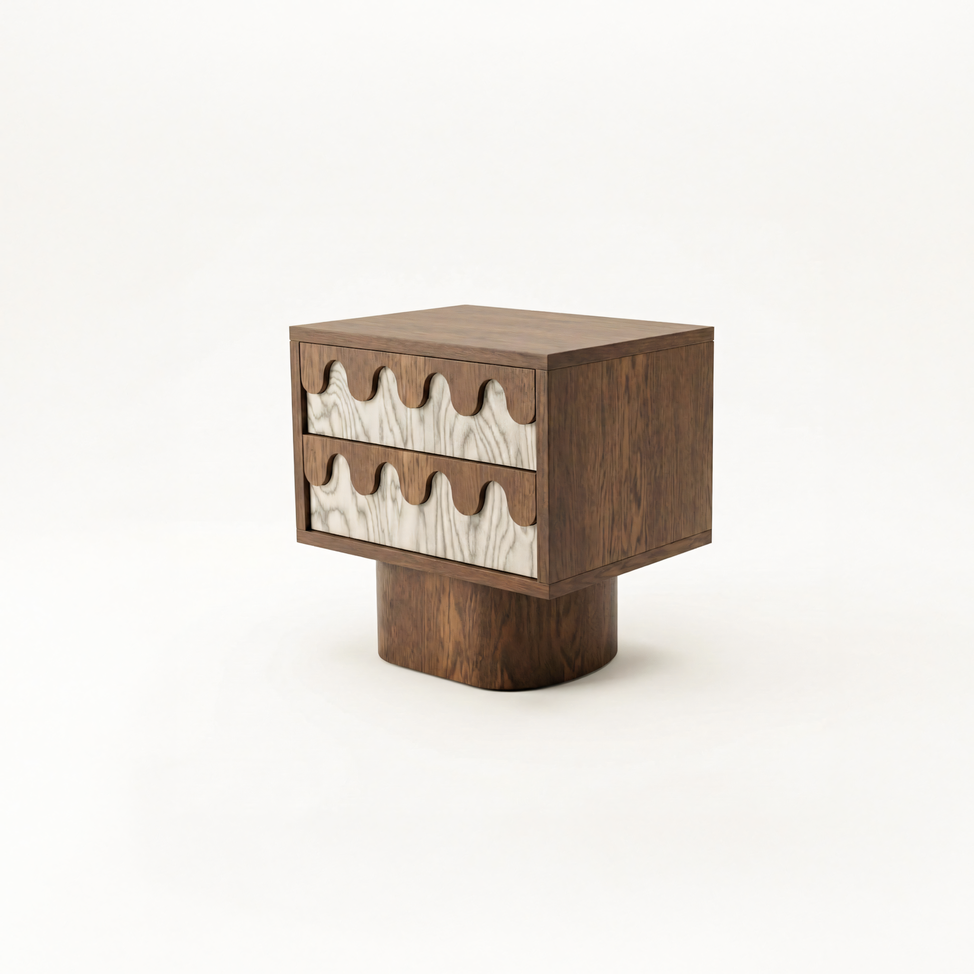 Noční stolek Merrow zaujme vyváženými proporcemi a čistým, rytmickým čelem tvořeným dvěma zásuvkami. Jemné detaily a klidná geometrie dodávají nábytku architektonický charakter a přinášejí do ložnice harmonii a lehkost.