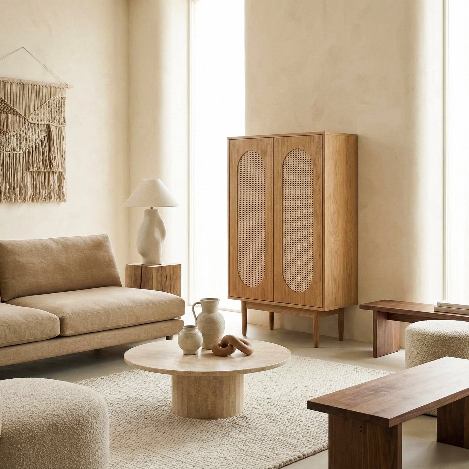 With its tall silhouette and oval rattan inlays, MOON exudes a sense of lightness and natural charm. This highboard brings warmth, calm, and a touch of Scandinavian minimalism to any interior.