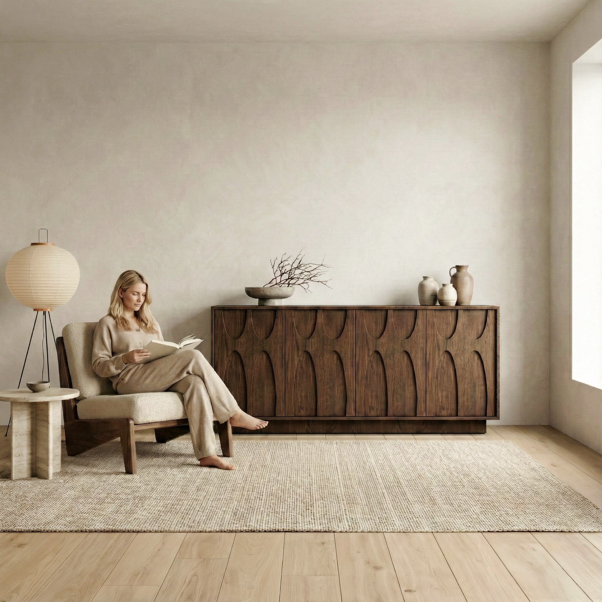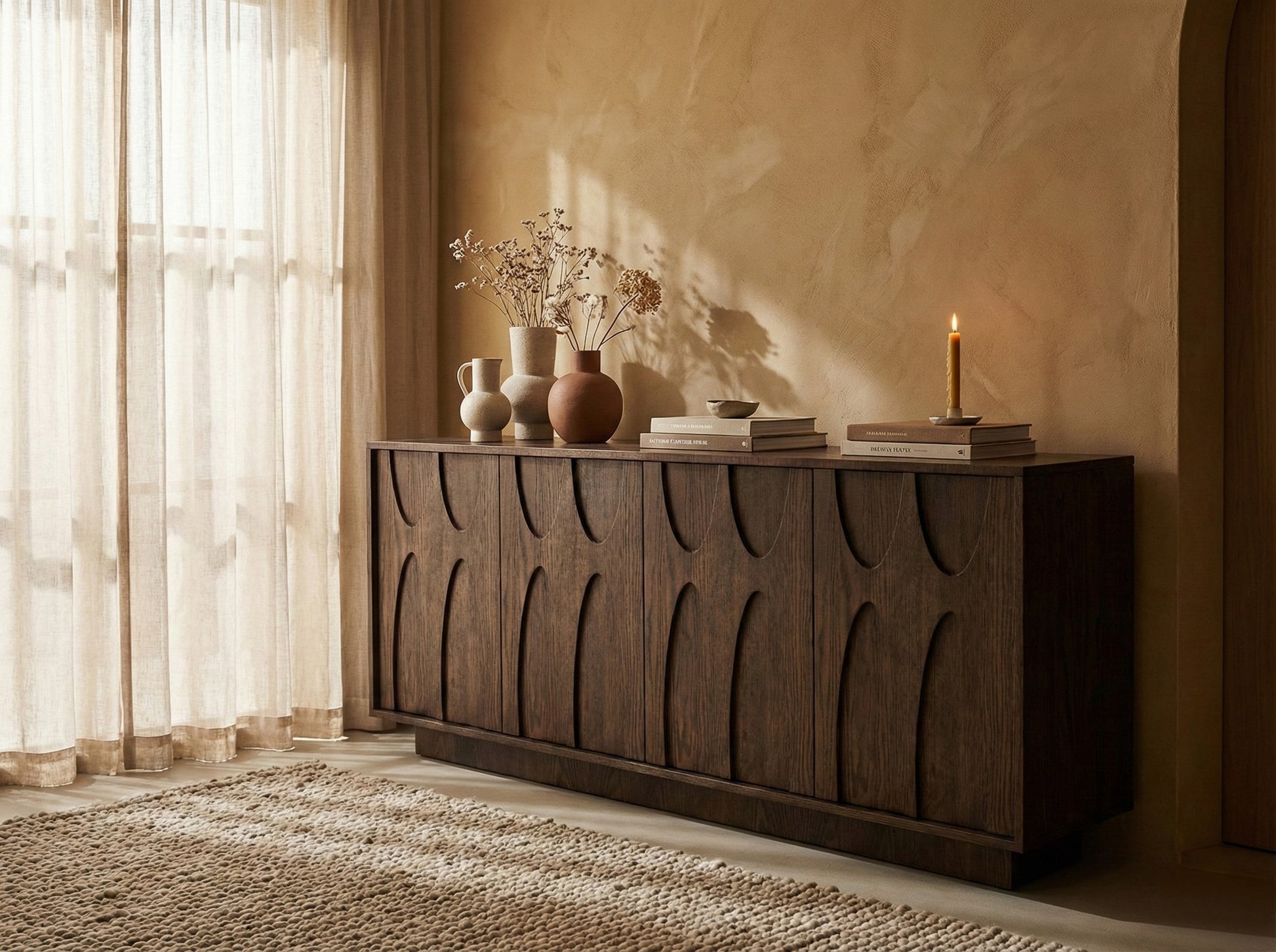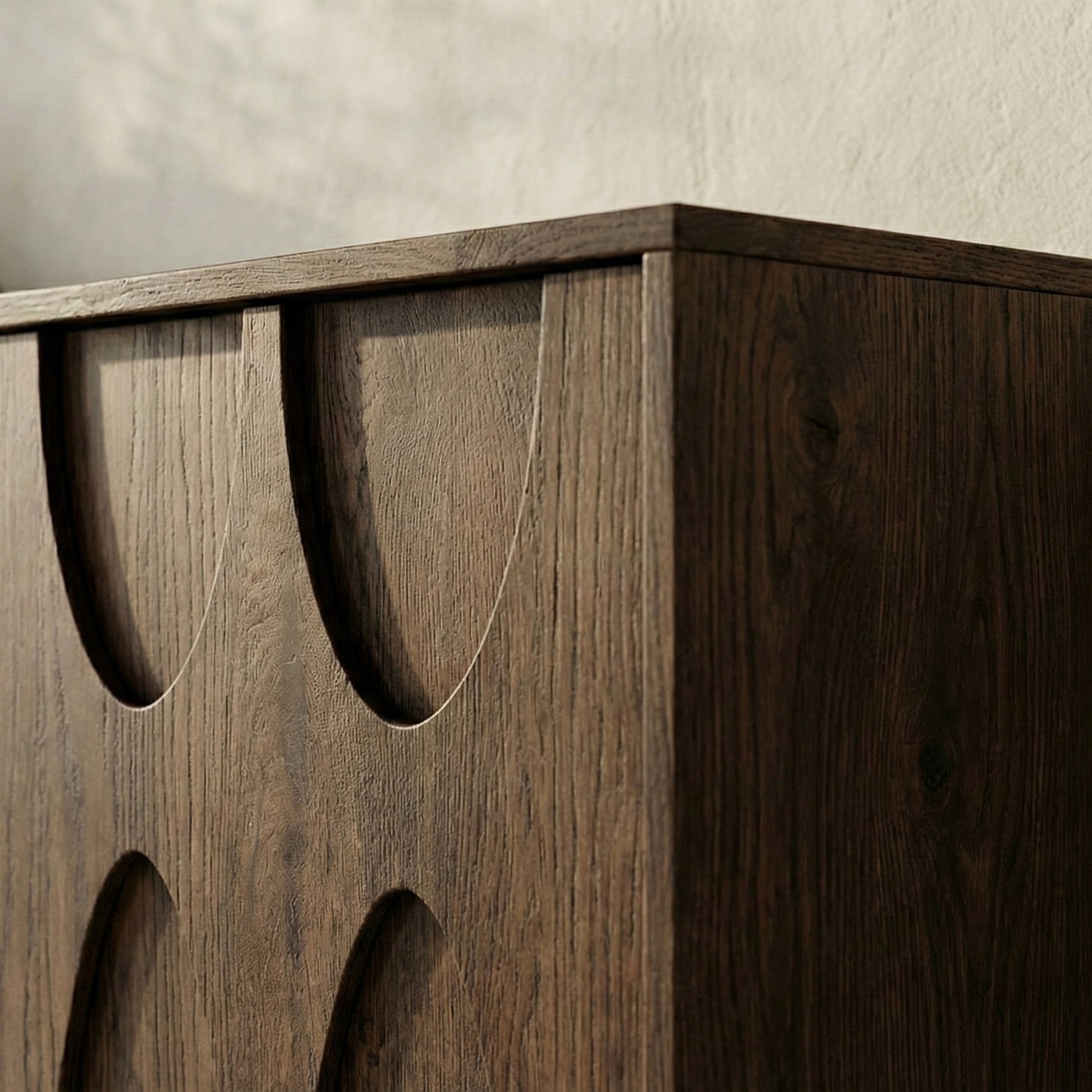 Komoda CALMA zosobňuje klidnou jistotu a přirozený rytmus. Její vytříbená silueta a jemně tvarované drážky vytvářejí na čelní straně klidné opakování, které do interiéru vnáší harmonii a řád.