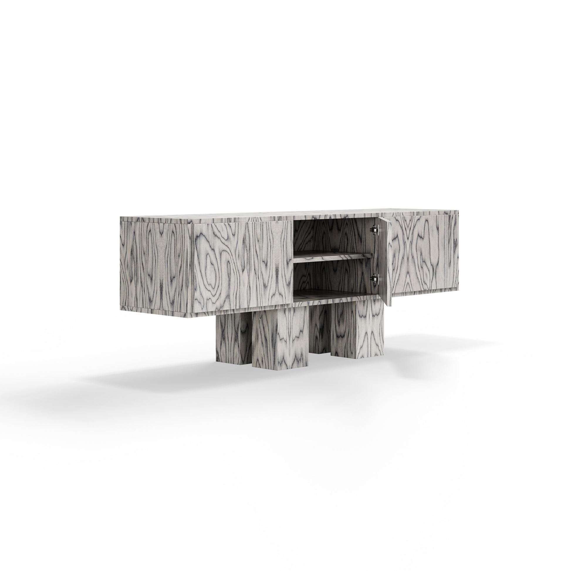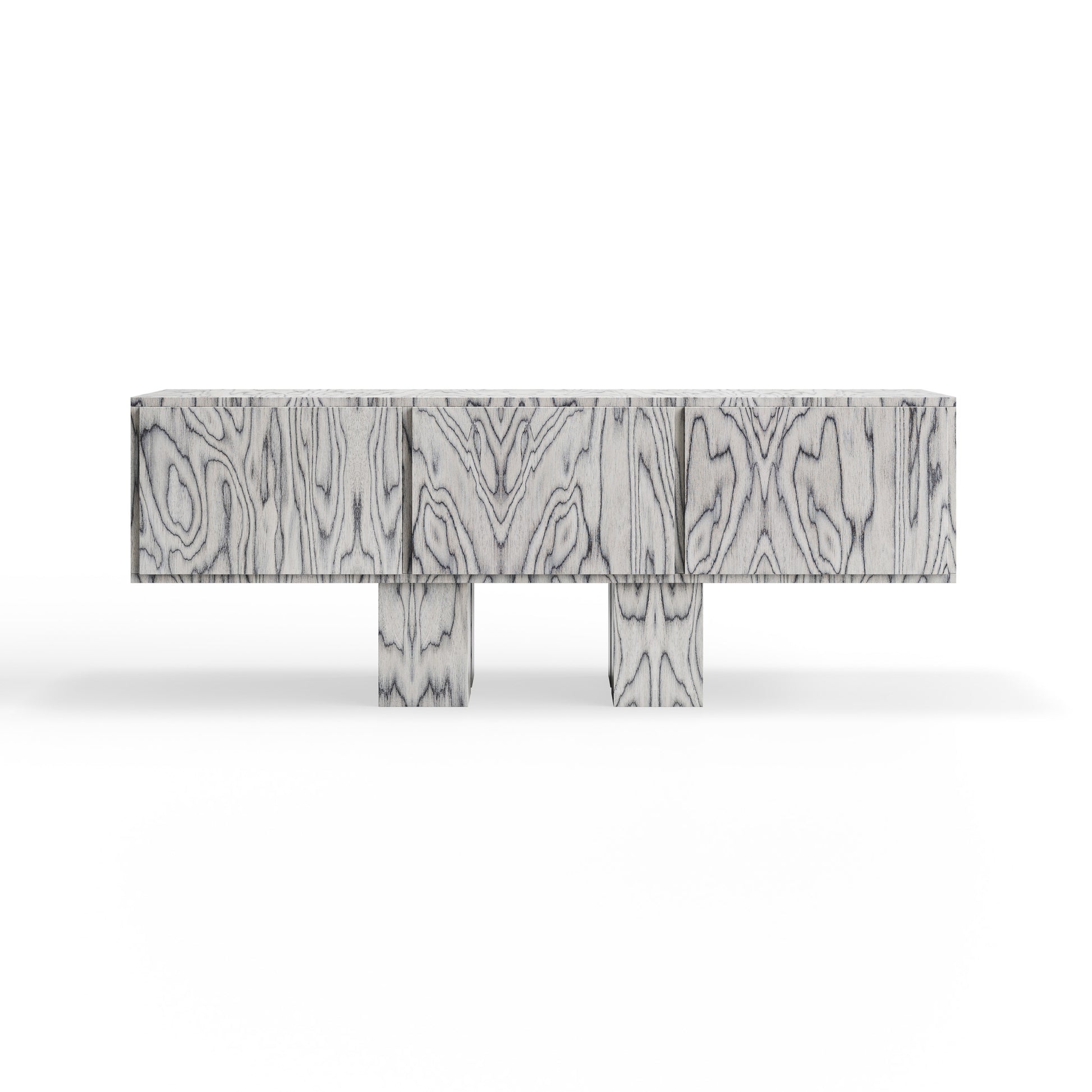 Komoda PILAR je výrazný kus nábytku – odvážný, architektonický a zároveň elegantní. Její čistý, protáhlý tvar zvýrazňuje přirozenou kresbu dřeva a vytváří silný vizuální rytmus, který působí moderně i nadčasově. Sochařské blokové nohy dodávají celé kompozici pevnost a stabilitu.